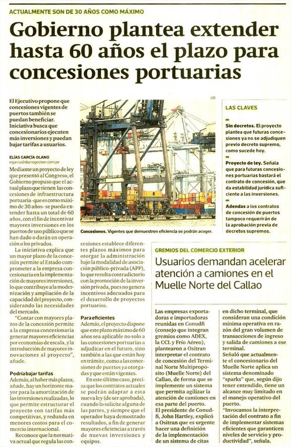 Las empresas exportadoras e importadoras reunidas en CONUDFI (consejo que integran gremios como ADEX, la CCL y Frío Aéreo), plantearon a Ositran interpretar el contrato de concesión del Terminal Norte Multipropósito (Muelle Norte) del Callao, de forma que se implemente un sistema que permita agilizar la atención de camiones en esa parte del puerto.
